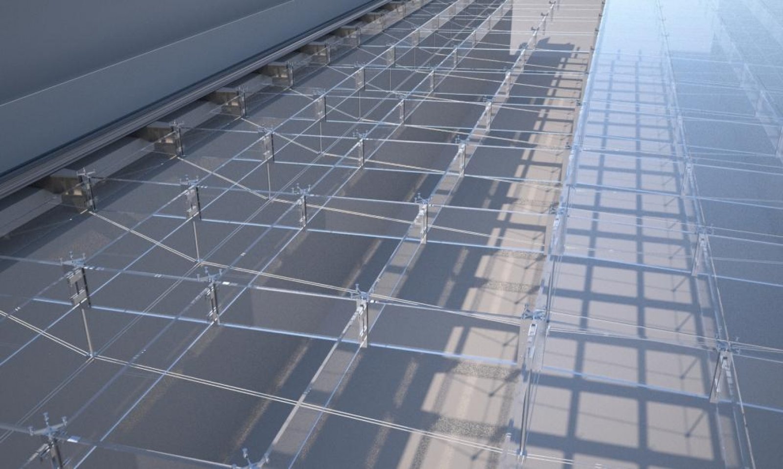 GLASS BEAMS AND COLUMNS SYSTEM AND CABLE: brace connection parts with stainless cable providing for passing the broad spans, column and beams elements and special corner.